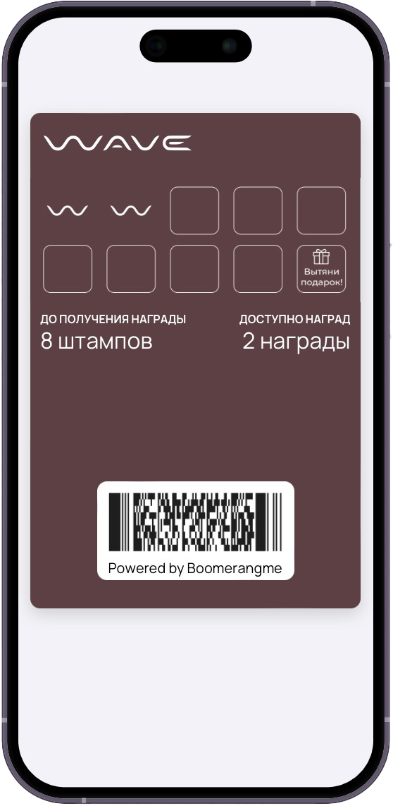 После получения первого штампа Вы оказываете услуги в Wave Beauty и зарабатываете дополнительные штампы при каждом посещении. Количество посещений отслеживается с использованием карты в мобильном кошельке, что позволяет нам удобно контролировать начисления.